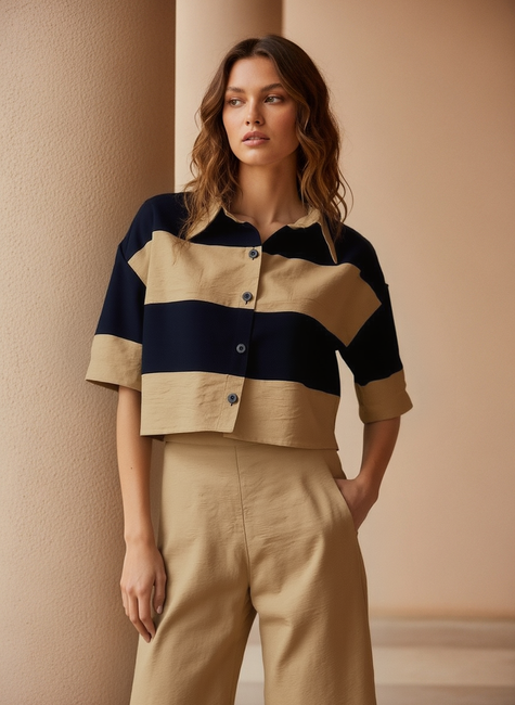 Essa camisa cropped é a peça-chave para um visual moderno e sofisticado. Com modelagem ampla e comprimento encurtado, ela apresenta listras largas em contraste elegante, que conferem um visual contemporâneo e atemporal. O fechamento frontal por botões e a gola clássica trazem um toque refinado ao design despojado.